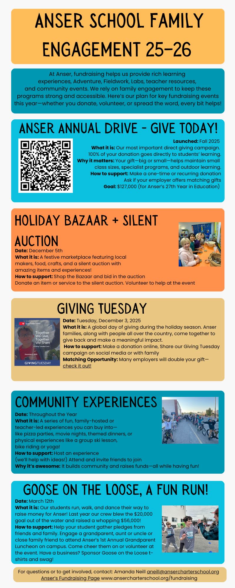 Why do we need your support? Anser receives no state funding for offering these adventurous learning opportunities for your student. Each year, we join together as a Crew to make sure that Anser’s children receive these transformative experiences that make their learning journey at Anser unique.